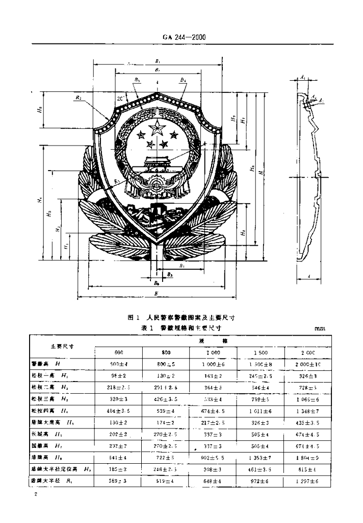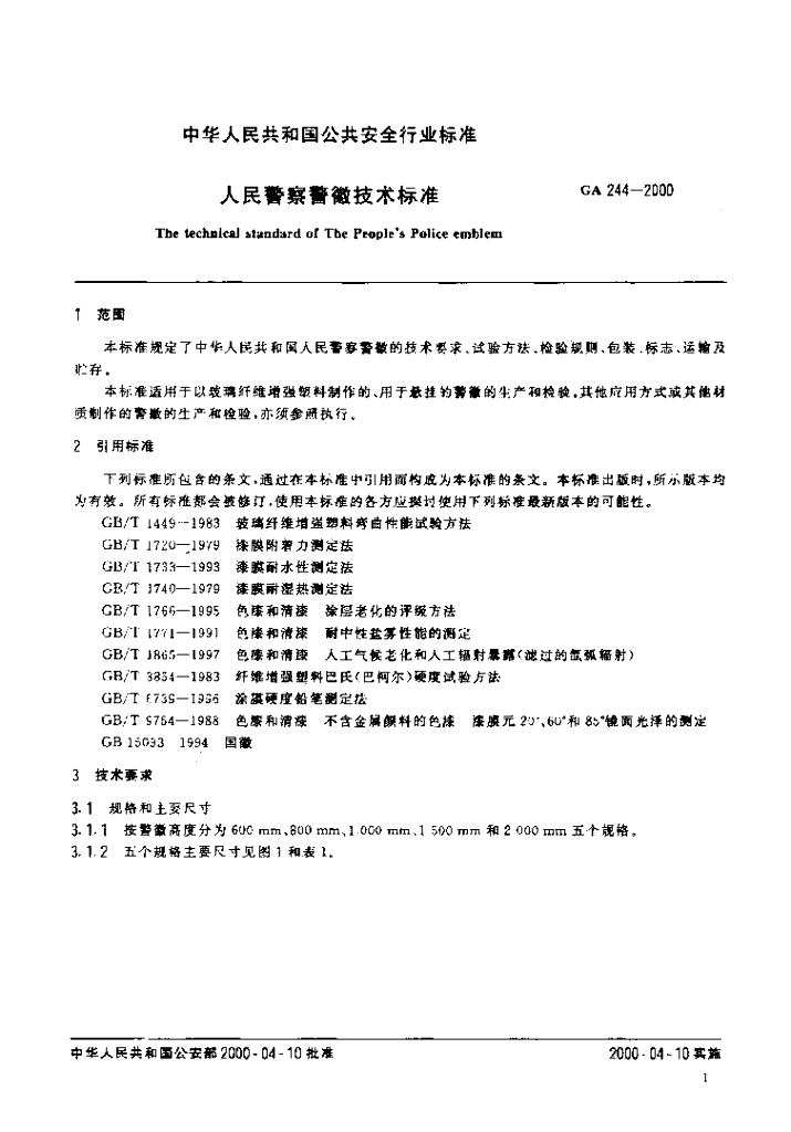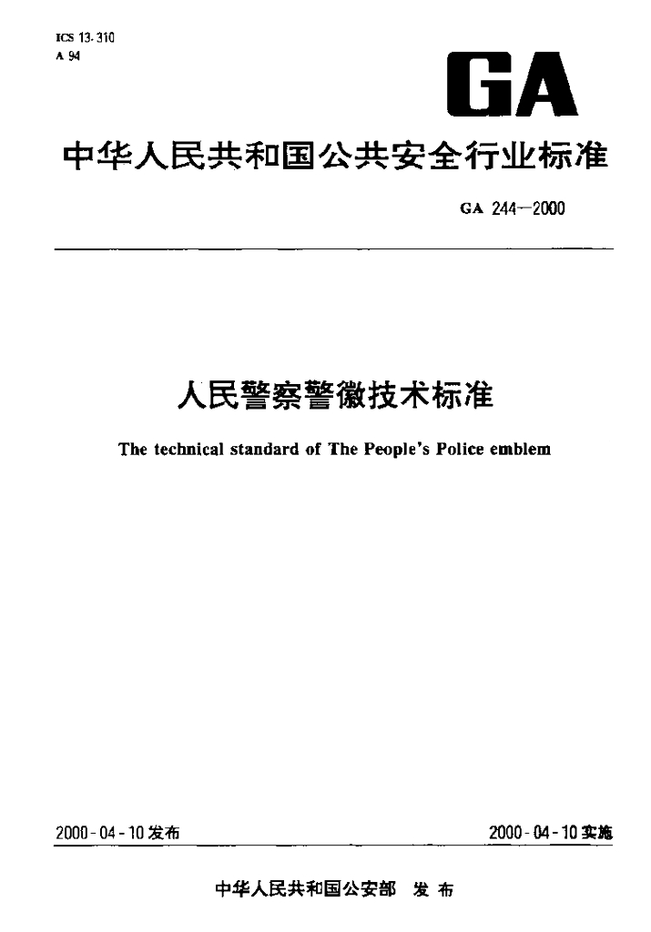 GA 244-2000 人民警察警徽技术标准