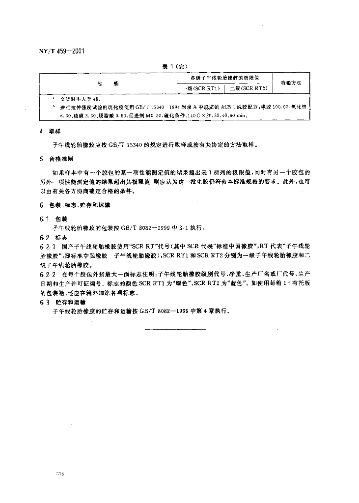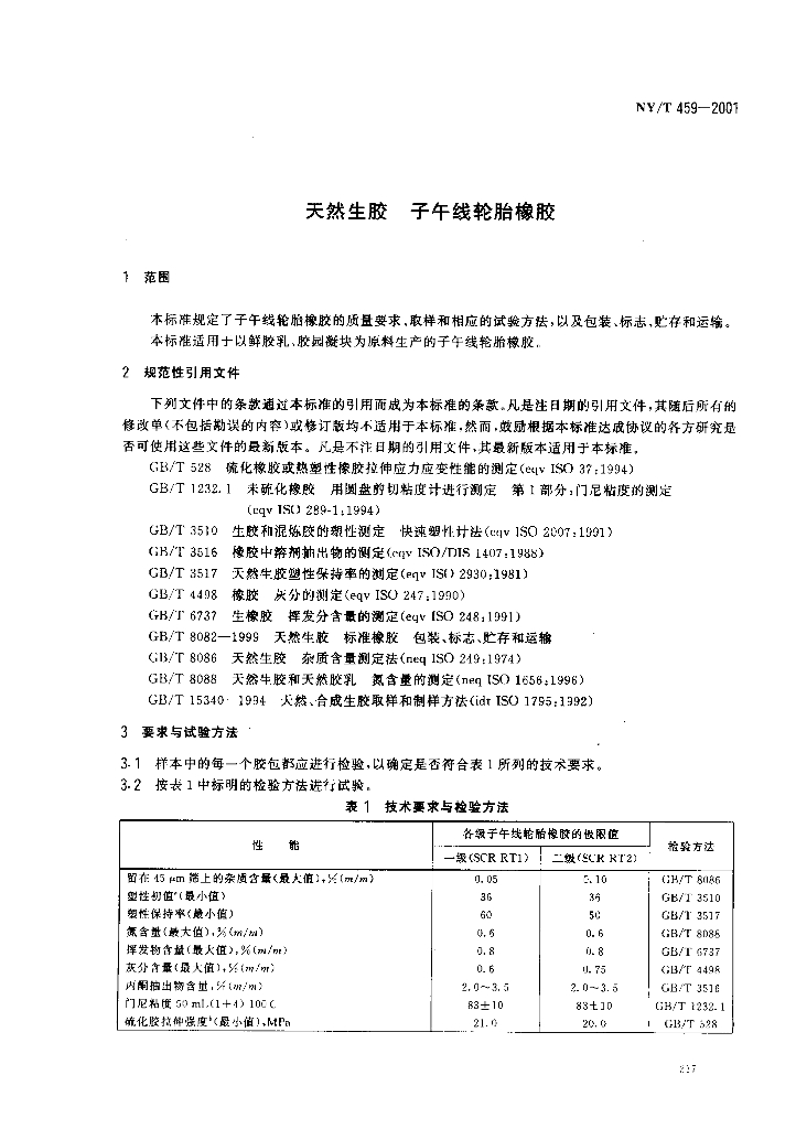 NY/T 459-2001 天然生胶 子午线轮胎橡胶