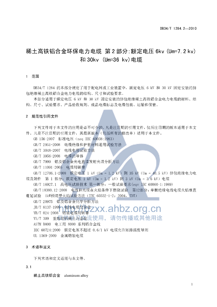 DB34/T 1284.2-2010 稀土高铁铝合金电力电缆 第2部分:额定电压6kv (Um=7.2 kv)和30kv (Um=36 kv)电缆