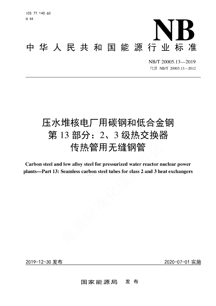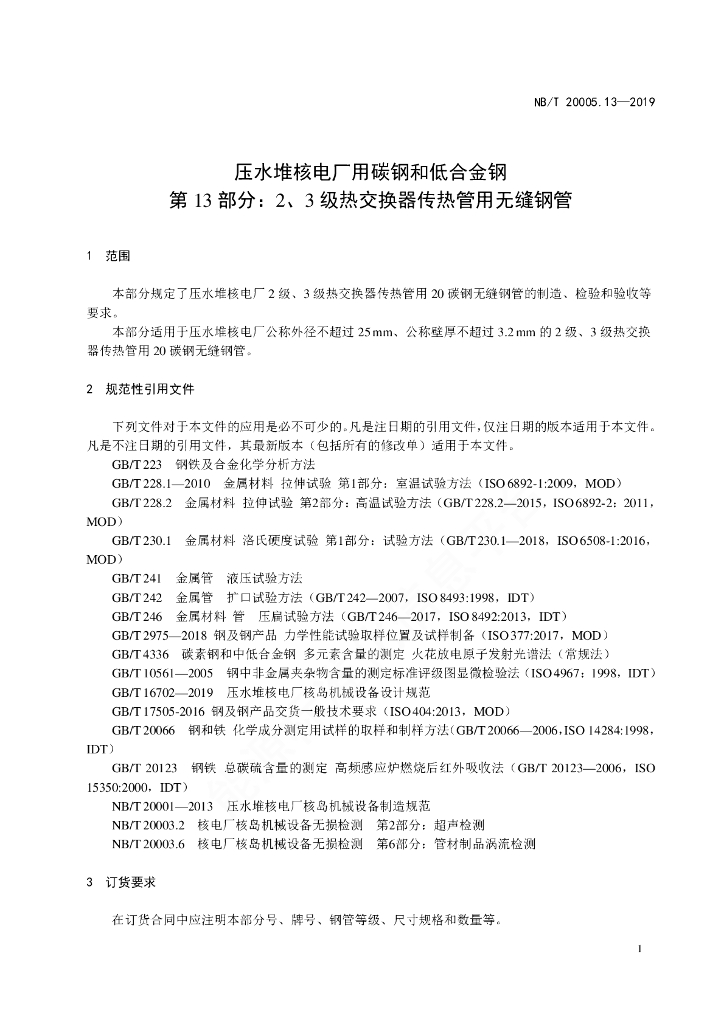 NB/T 20005.13-2019 压水堆核电厂用碳钢和低合金钢 第13部分:2、3级热交换器传热管用无缝钢管