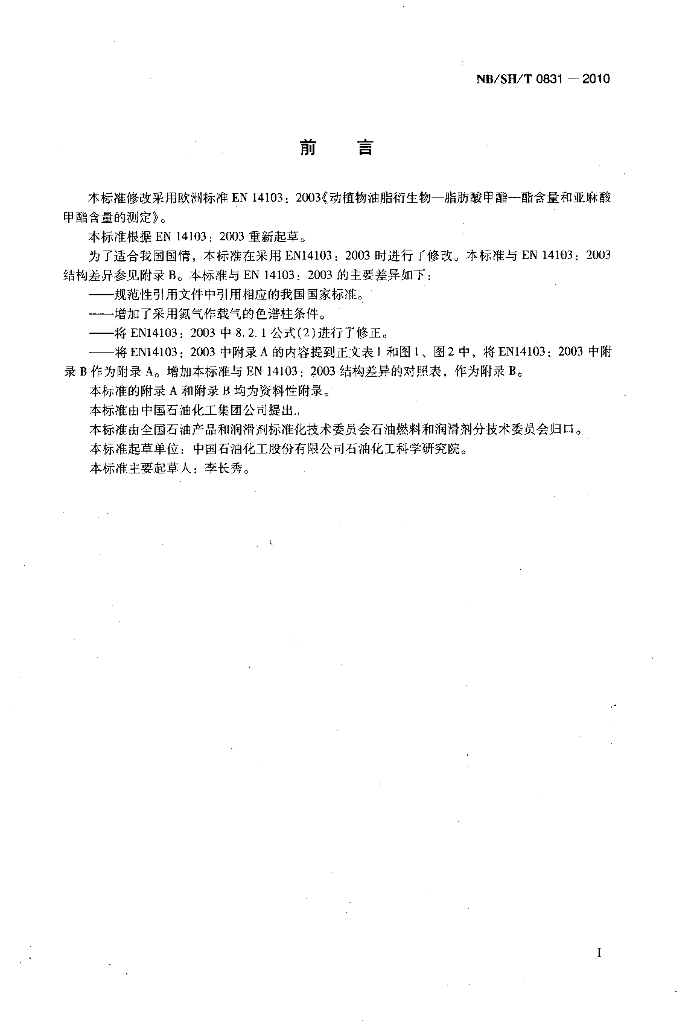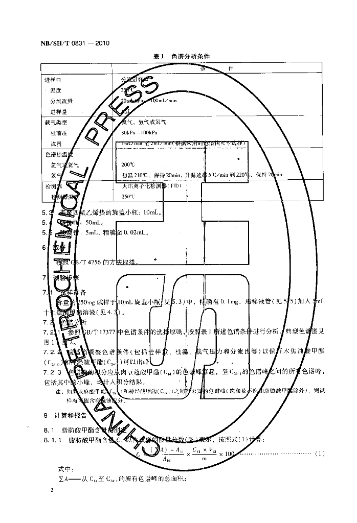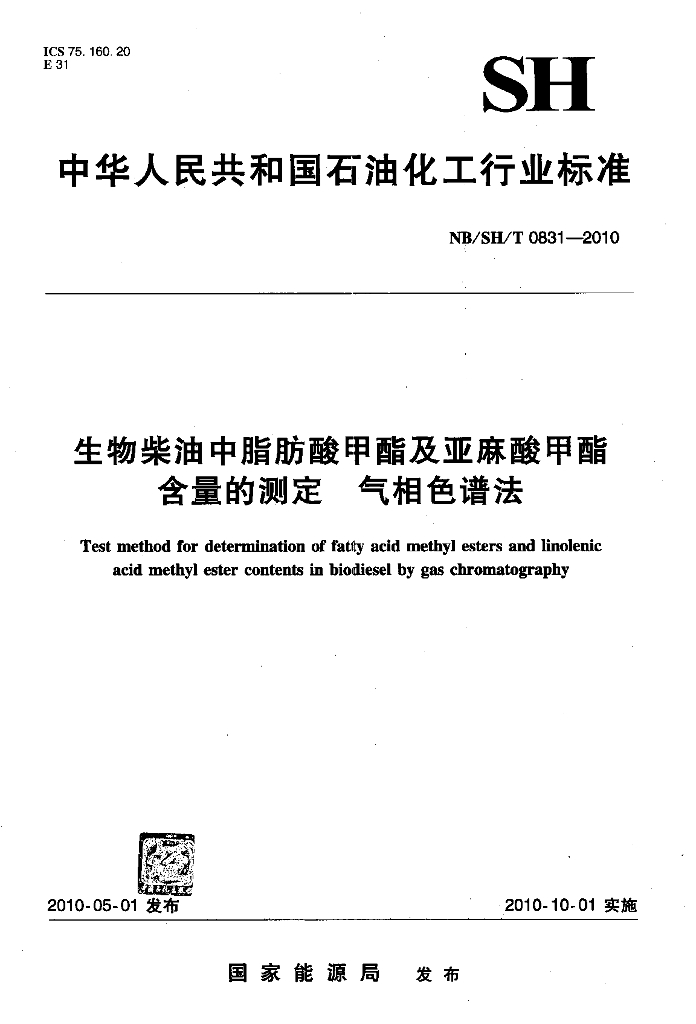 NB/SH/T 0831-2010 生物柴油中脂肪酸甲酯及亚麻酸甲酯含量的测定 气相色谱法