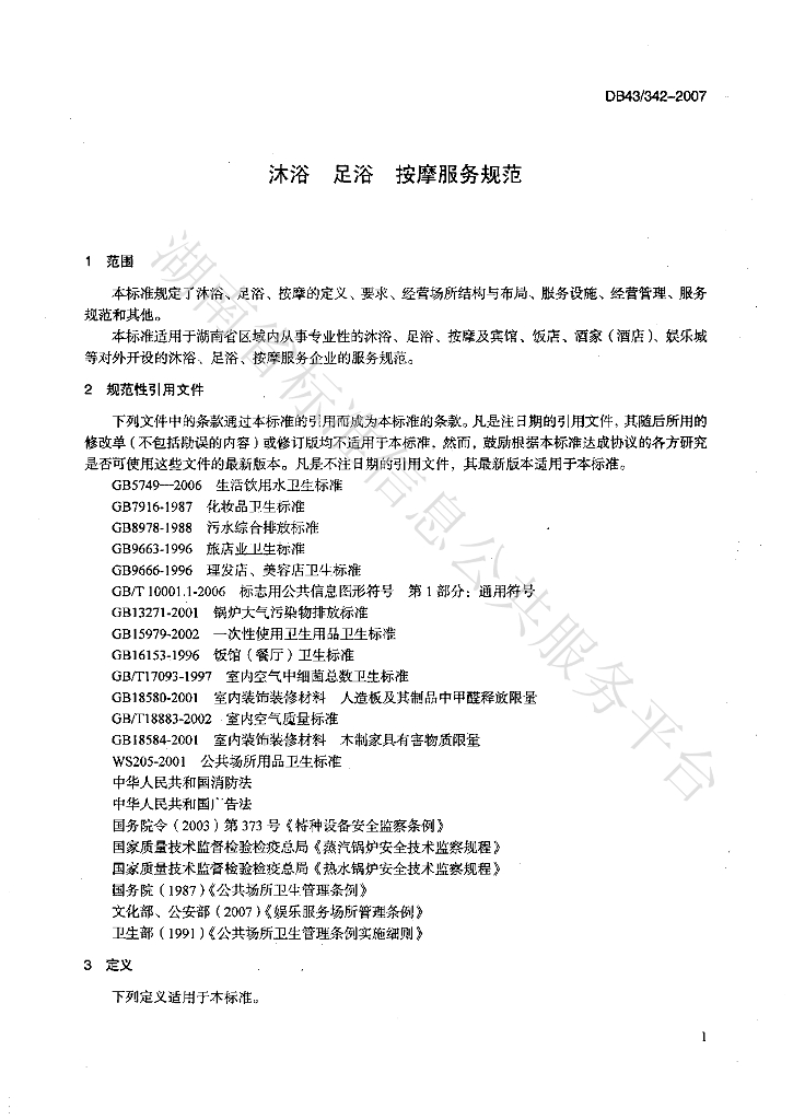 DB43/ 342-2007 沐浴 足浴 按摩服务规范