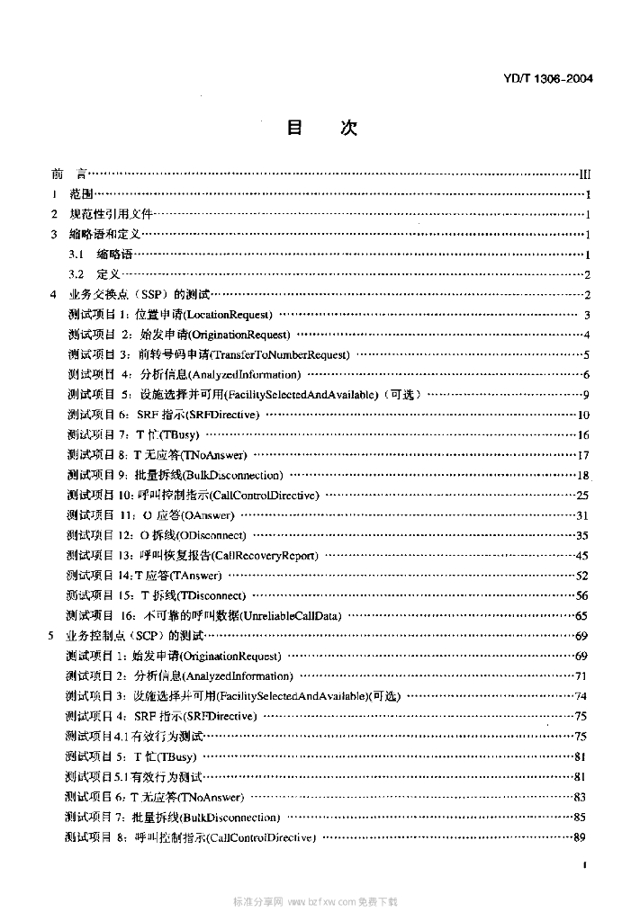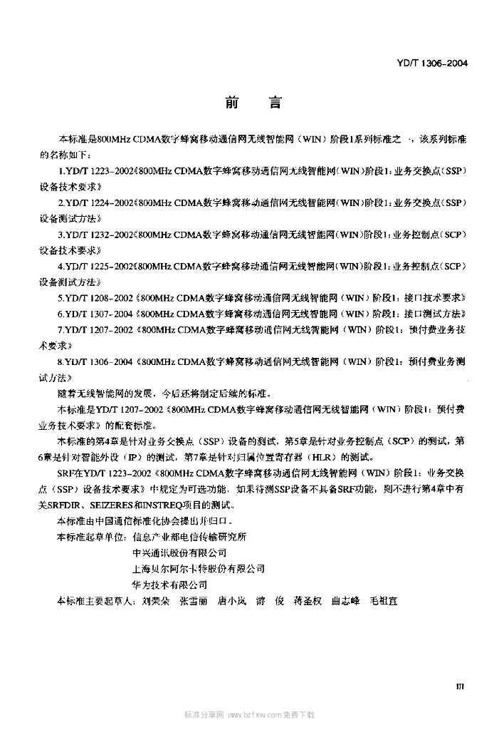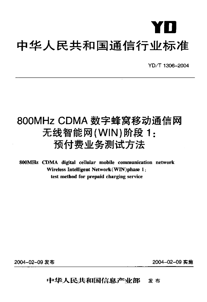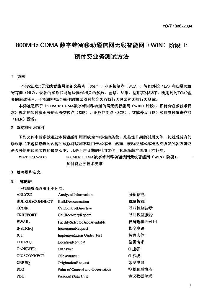 YD/T 1306-2004 800MHz CDMA 数字蜂窝移动通信网无线智能网(WIN)阶段1:预付费业务测试方法
