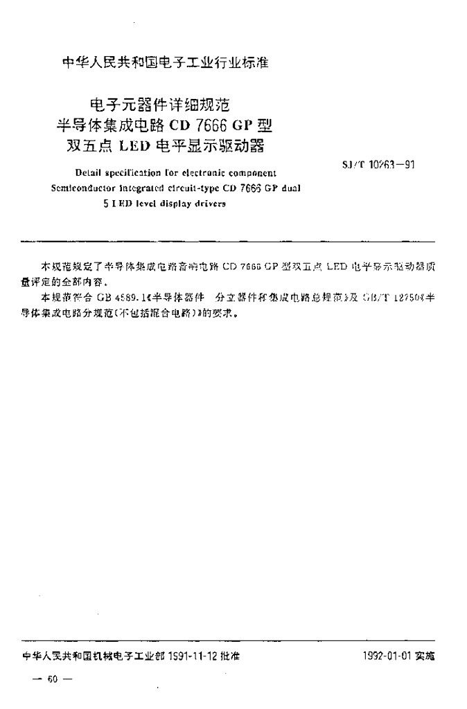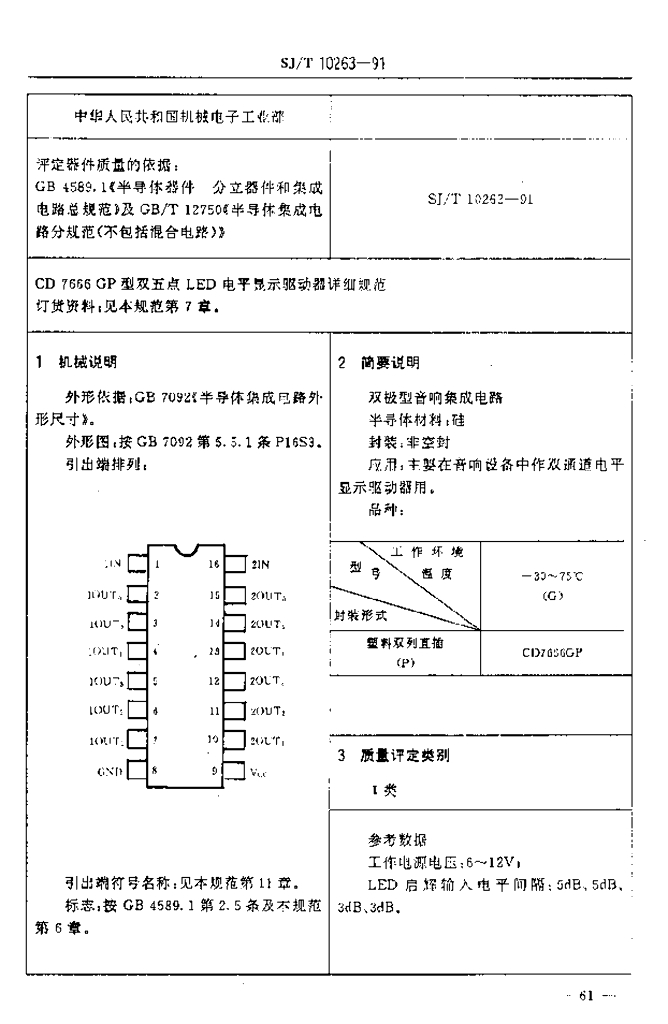 SJ/T 10263-1991 电子元器件详细规范 半导体集成电路CD7666GP型双五点LED电平显示驱动器
