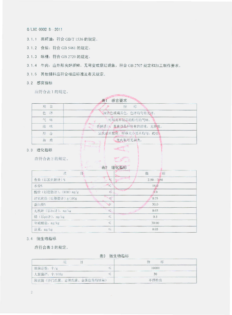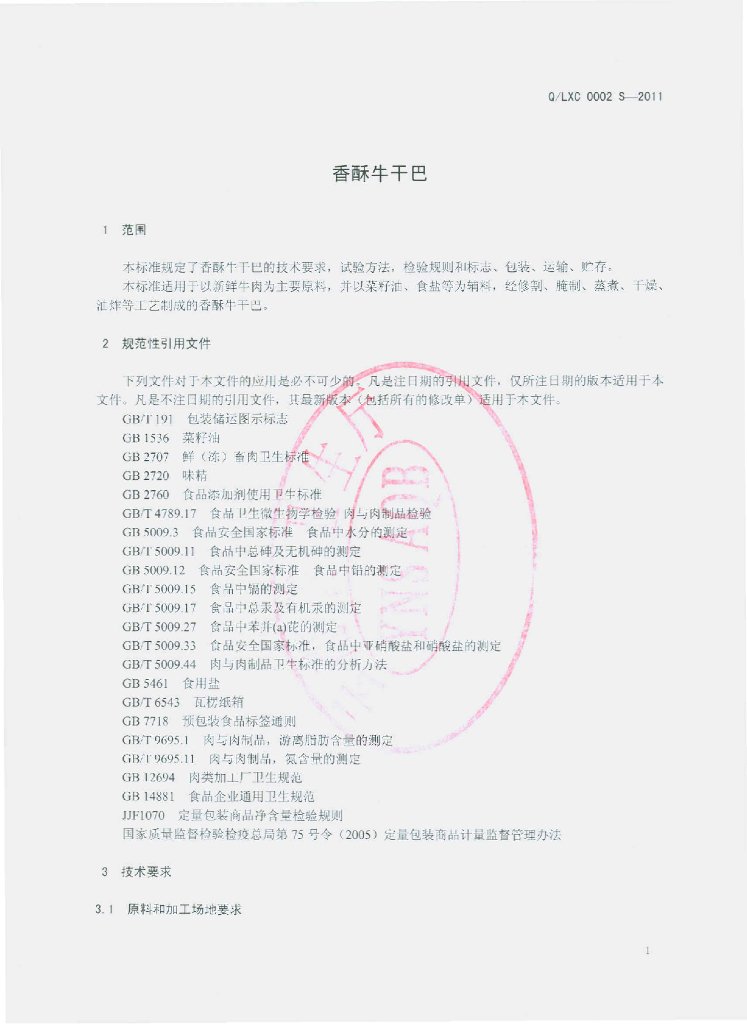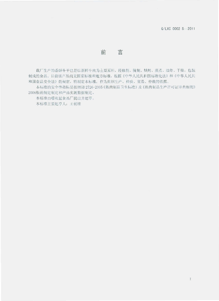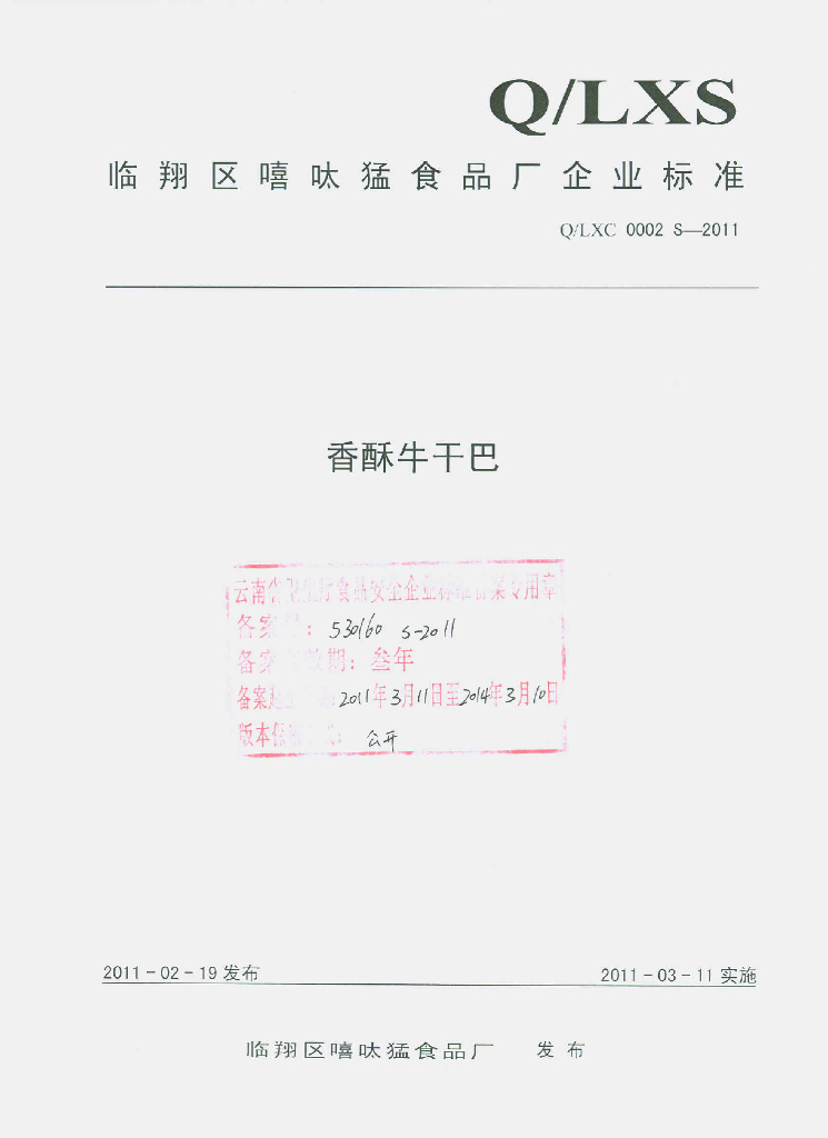 Q/LXC 0002S-2011 香酥牛干巴