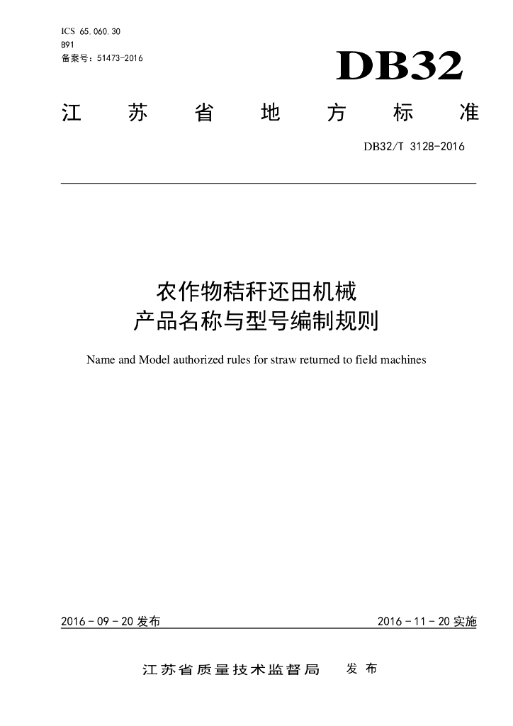 DB32/T 3128-2016 农作物秸秆还田机械产品名称与型号编制规则