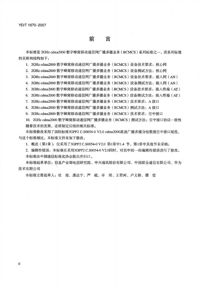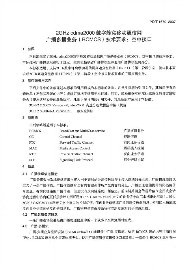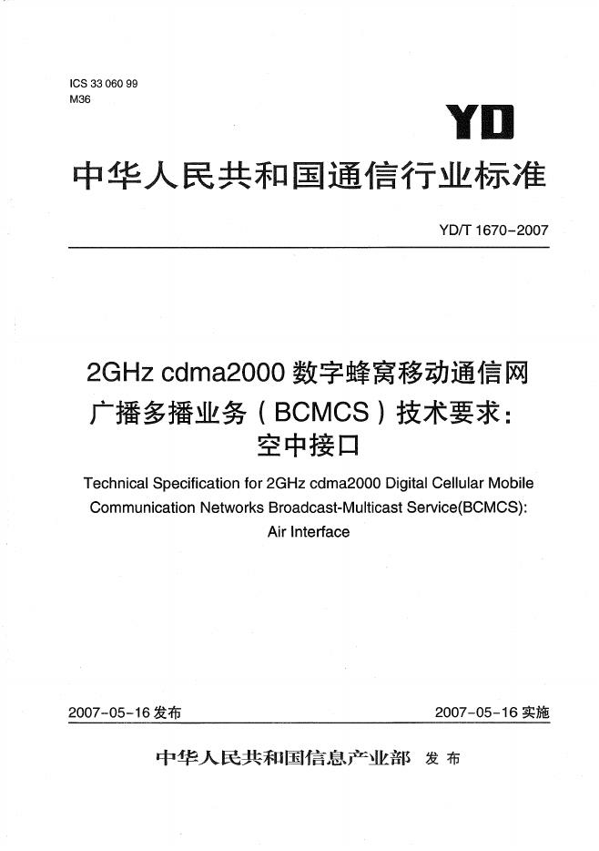 YD/T 1670-2007 2GHz cdma2000数字蜂窝移动通信网广播多播业务(BCMCS)技术要求:空中接口