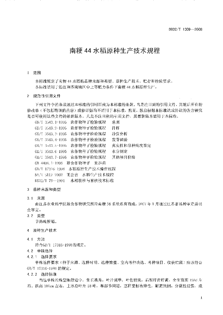 DB32/T 1309-2008 南粳44水稻原种生产技术规程