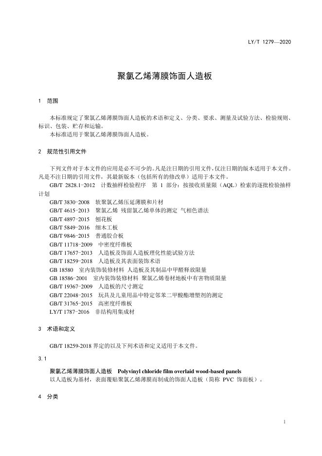 LY/T 1279-2020 聚氯乙烯薄膜饰面人造板