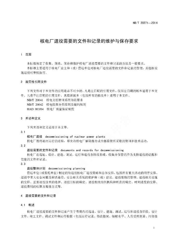 NB/T 20271-2014 核电厂退役需要的文件和记录的维护与保存要求