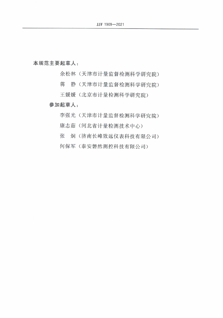 余松林(天津市计量监督检测科学研究院)、蒋静(天津市计量监督检测科学研究院)、王媛媛(北京市计量检测科学研究院)、李强光(天津市计量监督检测科学研究院)、康志茹(河北省计量检测技术中心)、张炯(济南长峰致远仪表科技有限公司)、何保军(泰安磐然测控科技有限公司)