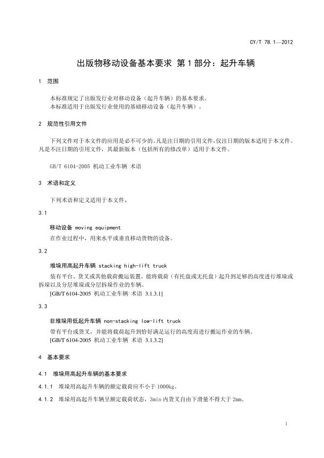 CY/T 78.1-2012 出版物移动设备基本要求 第1部分:起升车辆