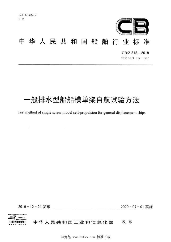 CB/Z 818-2019 一般排水型船船模单桨自航试验方法