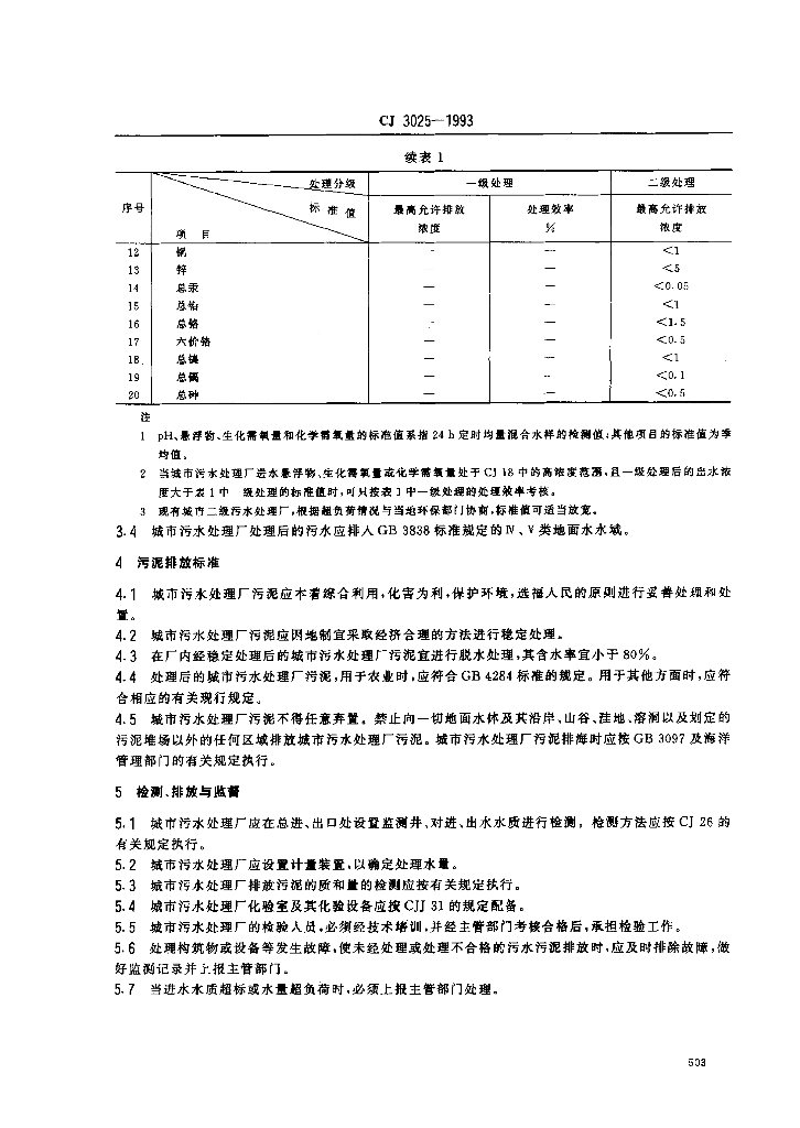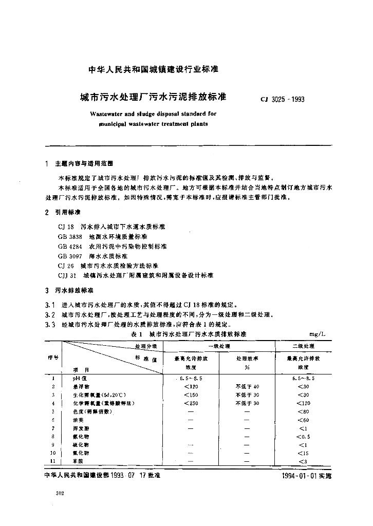 CJ 3025-1993 城市污水处理厂污水污泥排放标准