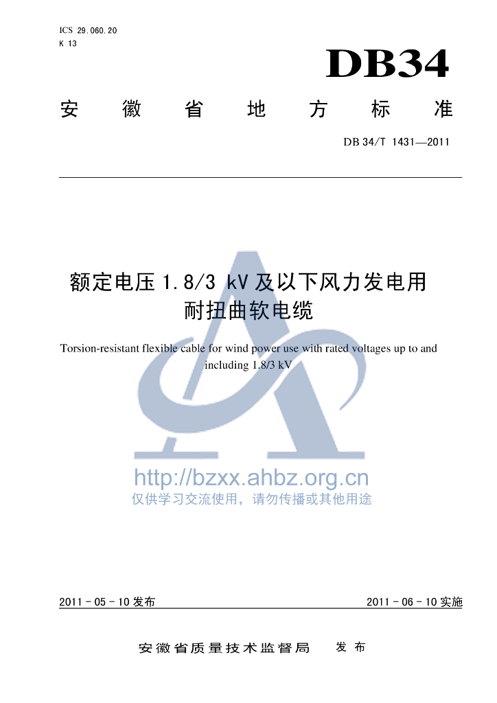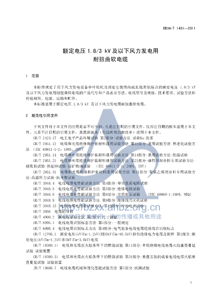 DB34/T 1431-2011 额定电压1.8/3kv及以下风力发电用耐扭曲软电缆