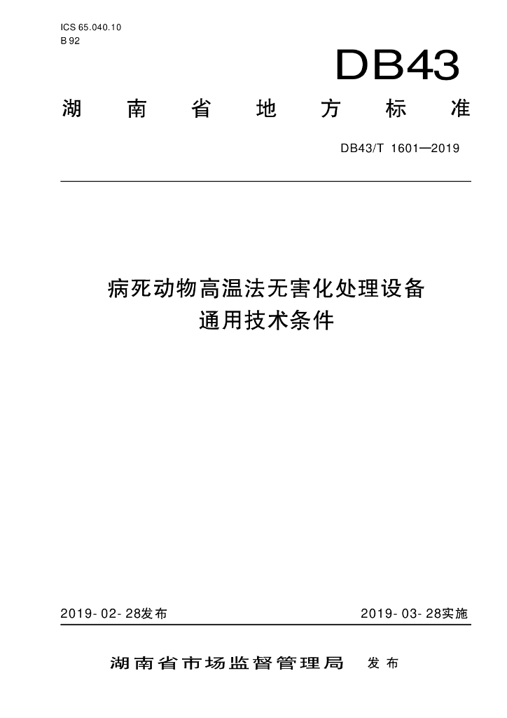 DB43/T 1601-2019 病死动物高温法无害化处理设备 通用技术条件