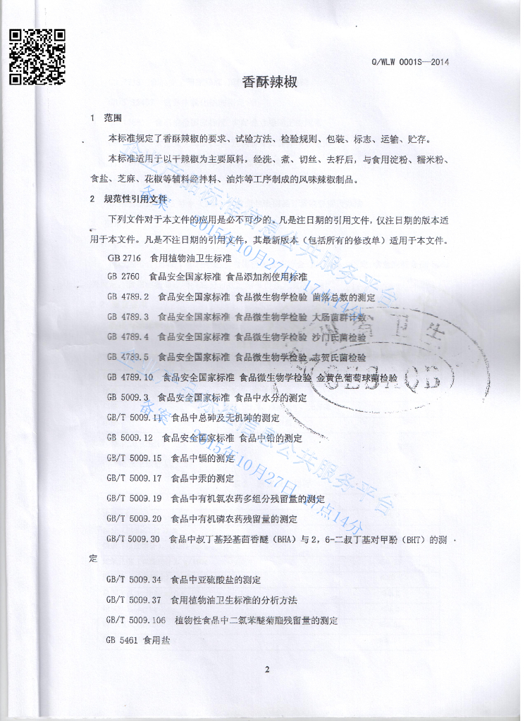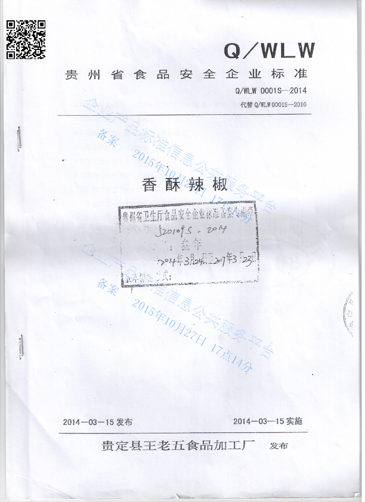 Q/WLW 0001S-2014 贵定县王老五食品加工厂 香酥辣椒