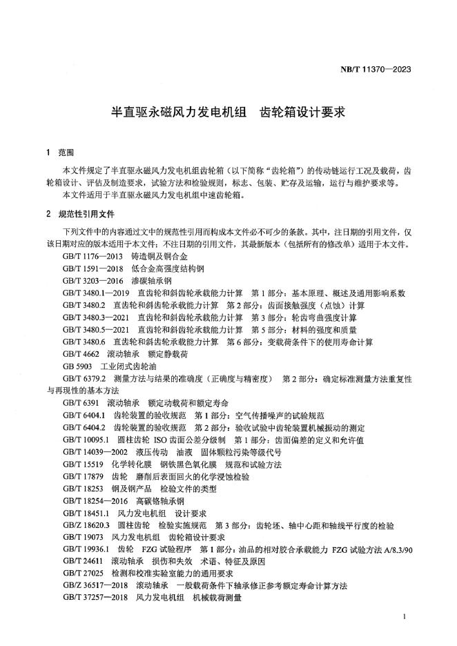 NB/T 11370-2023 半直驱永磁风力发电机组 齿轮箱设计要求