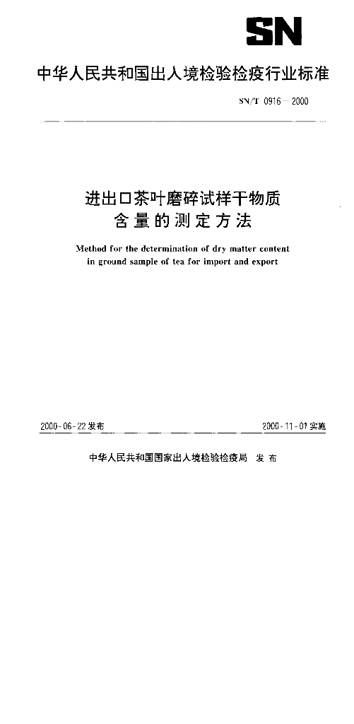 SN/T 0916-2000 进出口茶叶磨碎试样干物质含量的测定方法