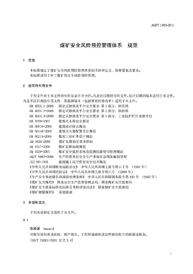 AQ/T 1093-2011 煤矿安全风险预控管理体系规范