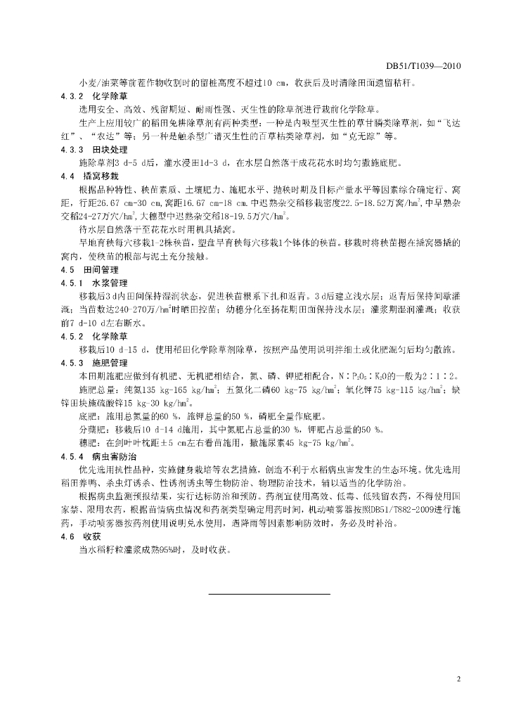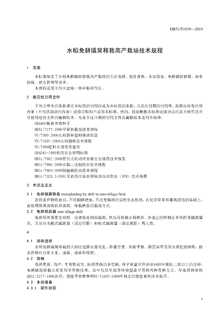 DB51/T 1039-2010 水稻免耕撬窝移栽高产栽培技术规程