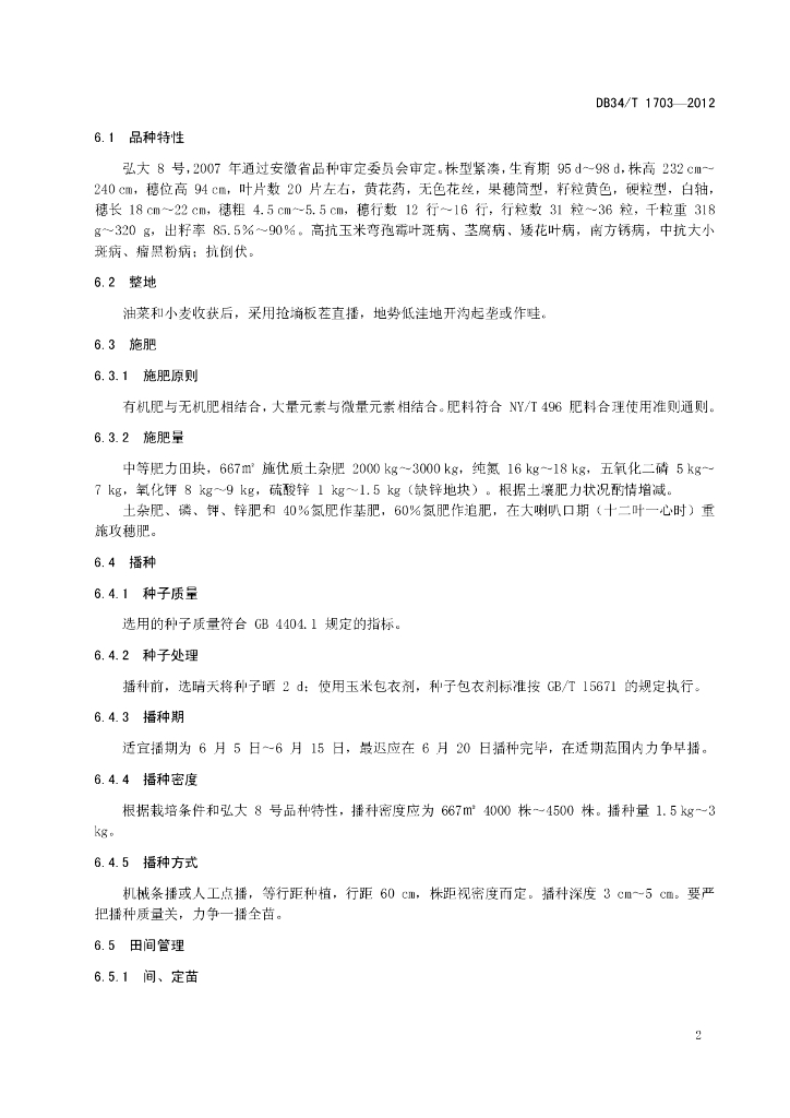 DB34/T 1703-2012 粮饲兼用玉米“弘大8 号”高产栽培技术规程