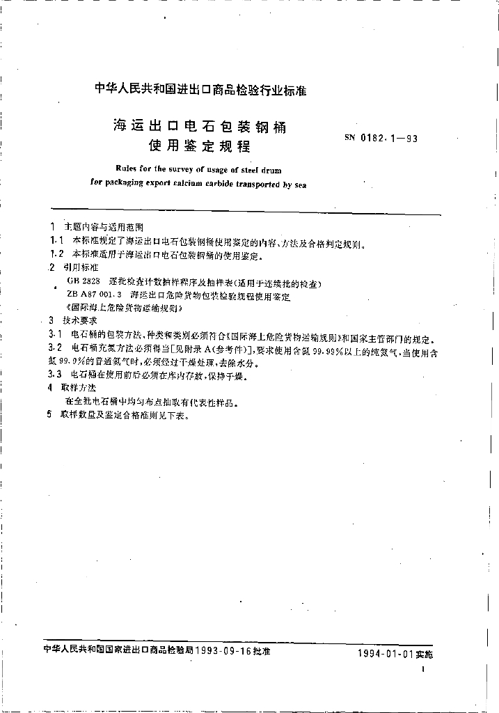 SN 0182.1-1993 海运出口电石包装钢桶使用鉴定规程