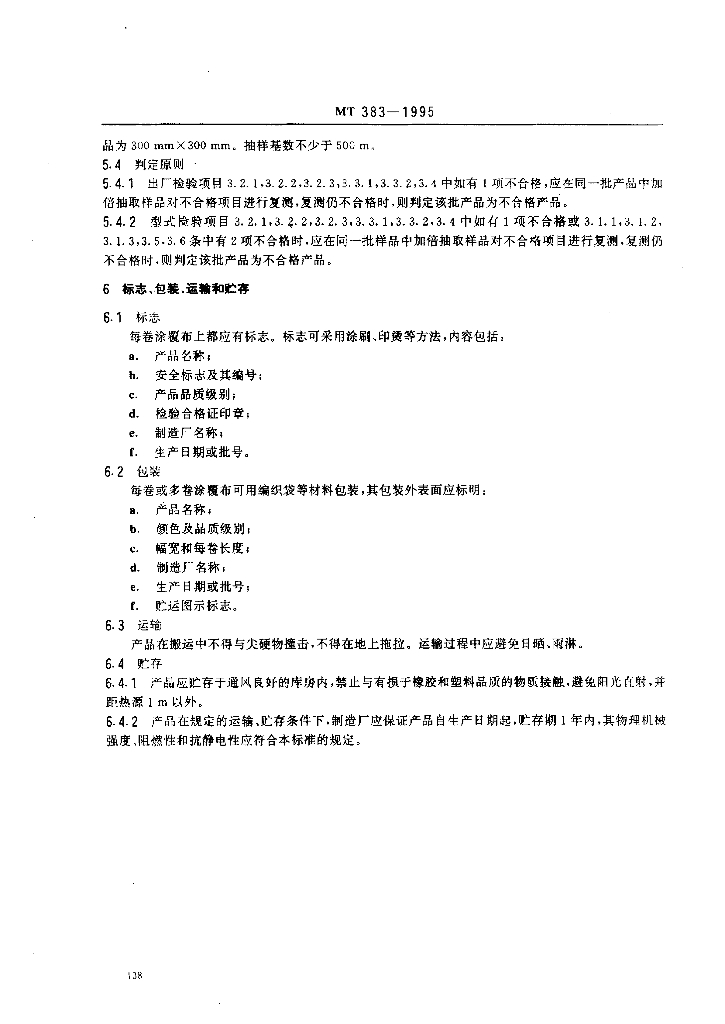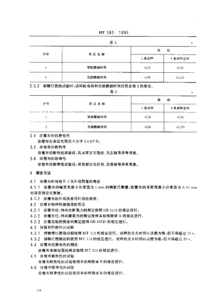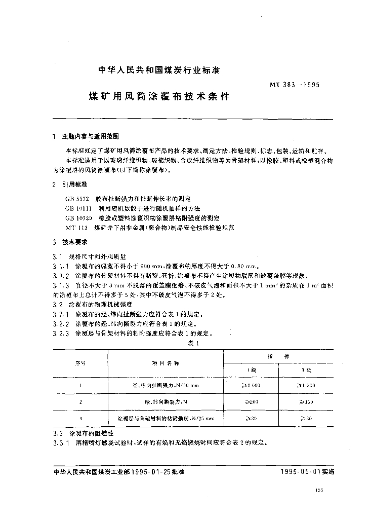 MT 383-1995 煤矿用风筒涂覆布技术条件