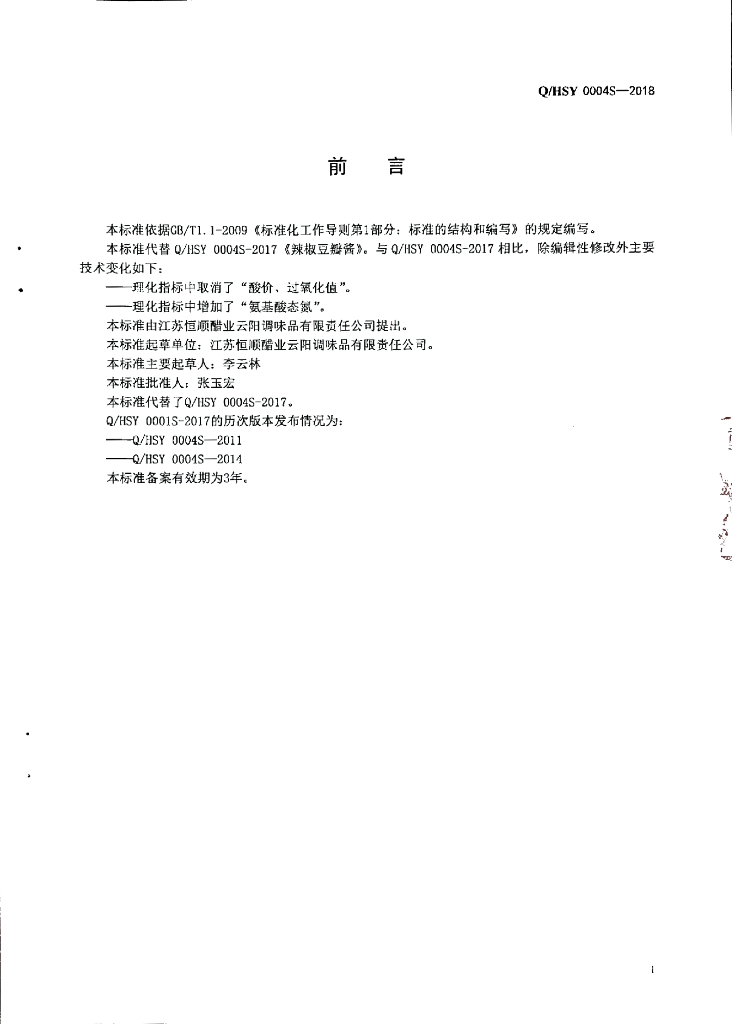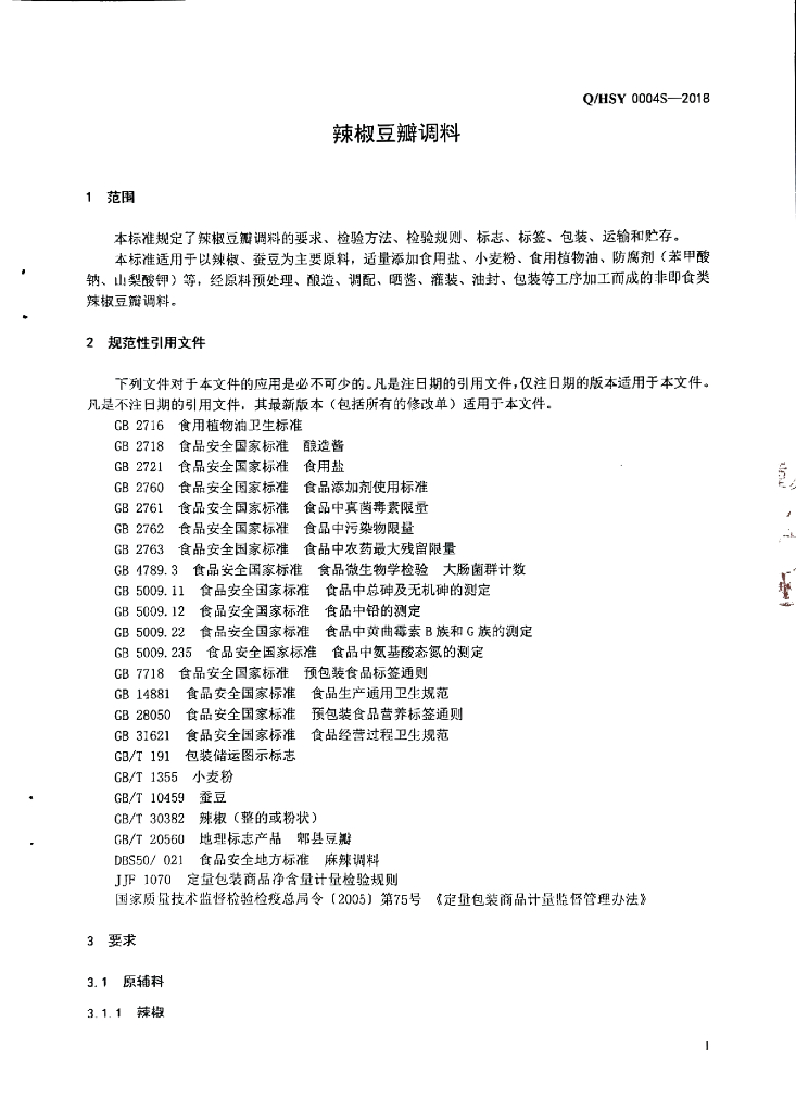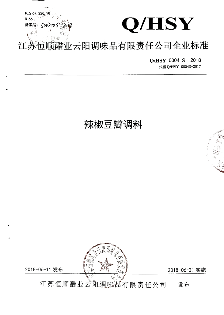 Q/HSY 0004S-2018 辣椒豆瓣调料