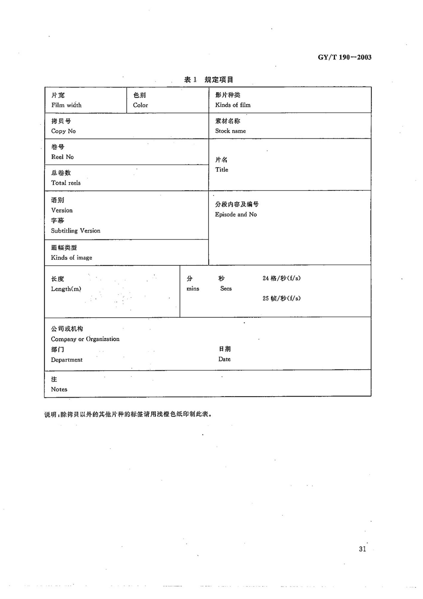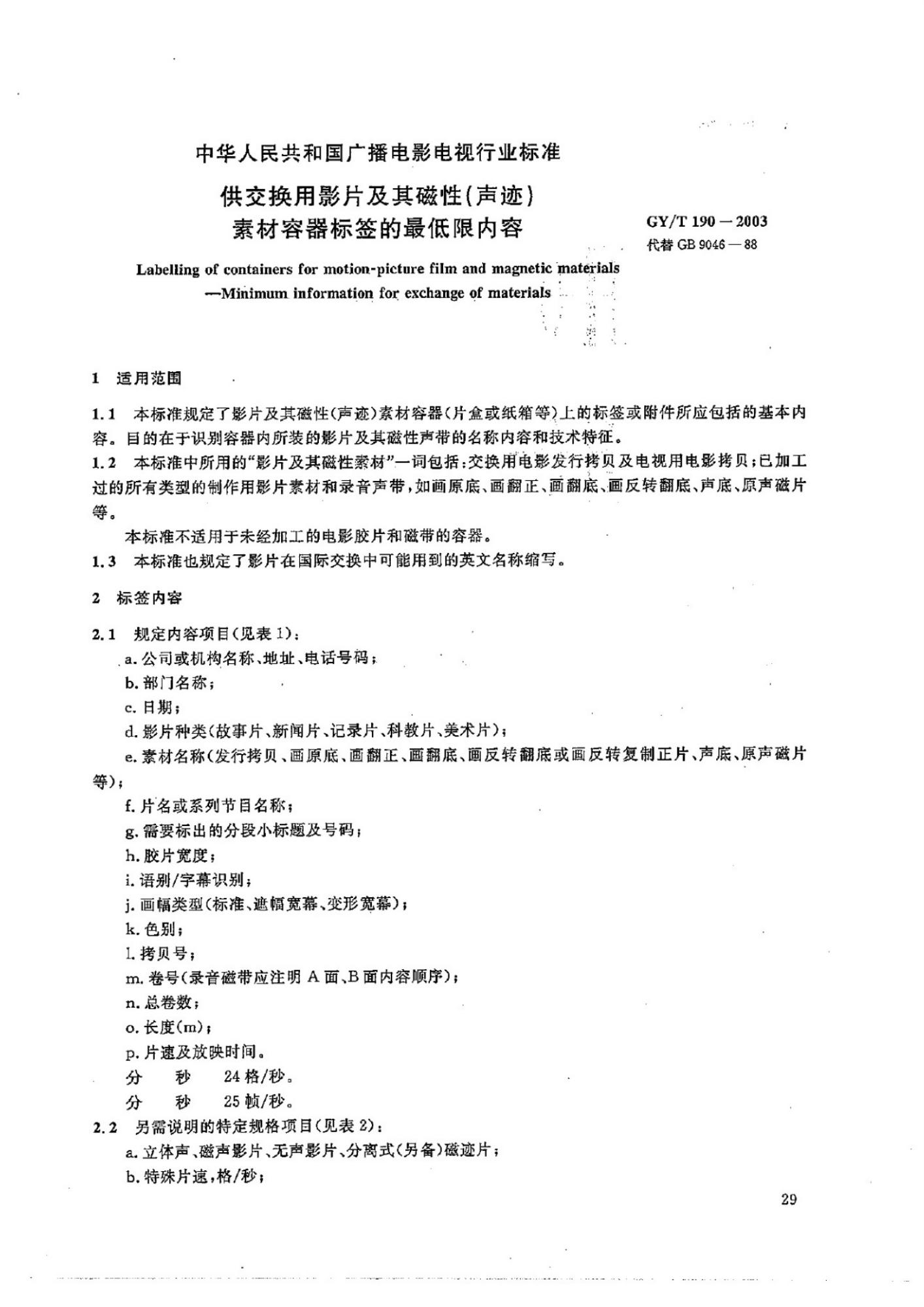 GY/T 190-2003 供交换用影片及其磁性(声迹)素材容器标签的最低限内容