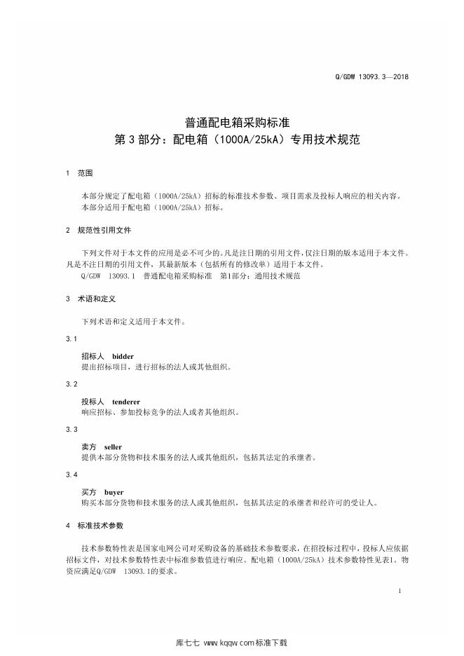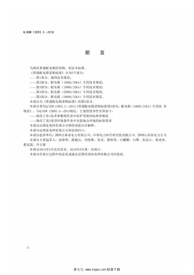 Q/GDW 13093.3-2018 普通配电箱采购标准 第3部分:配电箱 1000A 25kA 专用技术规范)