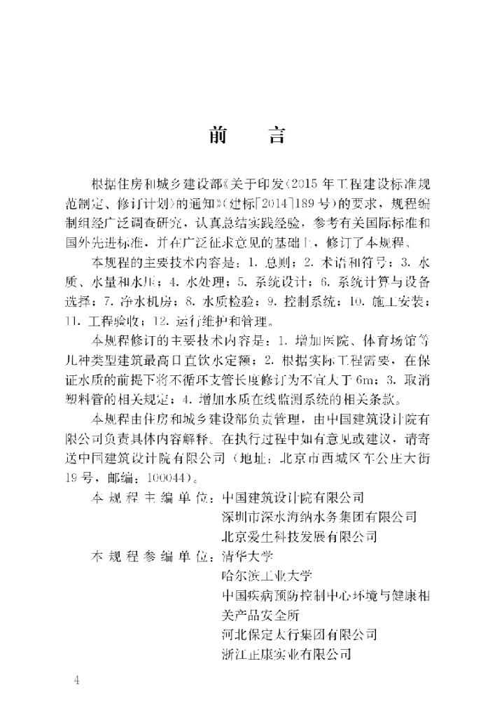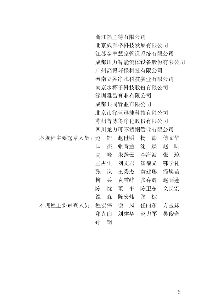中国建筑设计院有限公司、深圳市深水海纳水务集团有限公司、北京爱生科技发展有限公司、清华大学、哈尔滨工业大学、中国疾病预防控制中心环境与健康相关产品安全所、河北保定太行集团有限公司、浙江正康实业有限公司、浙江福兰特有限公司、北京威派格科技发展有限公司、江苏金羊慧家管道系统有限公司、成都川力智能流体设备股份有限公司、广州高得环保科技有限公司、海南立昇净水科技实业有限公司、南京水杯子科技股份有限公司、深圳雅昌管业有限公司、成都共同管业有限公司、北京市深蓝迅捷科技有限公司、苏州普滤得净化股份有限公司、四川龙力可不