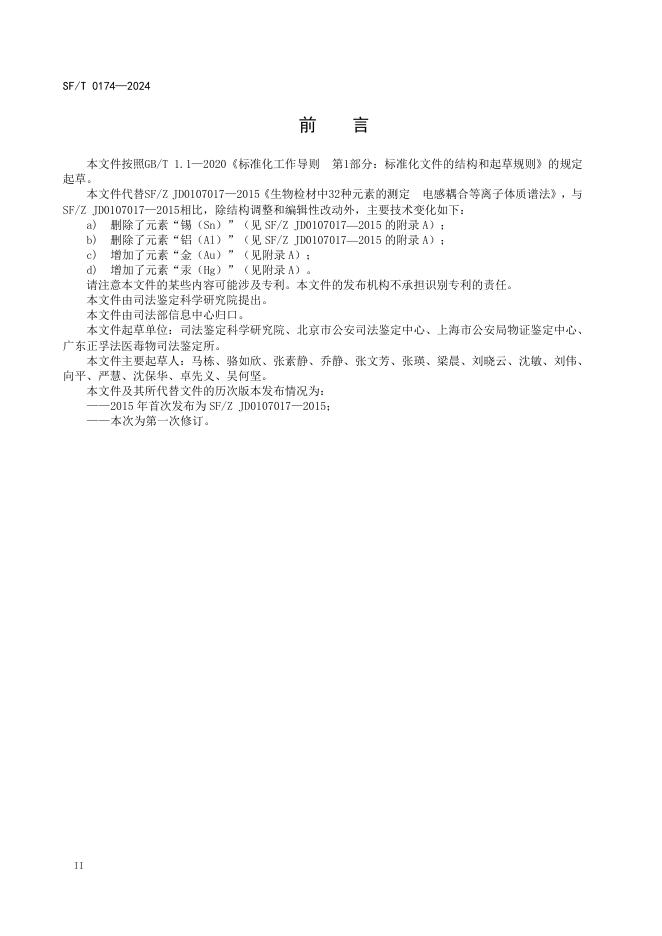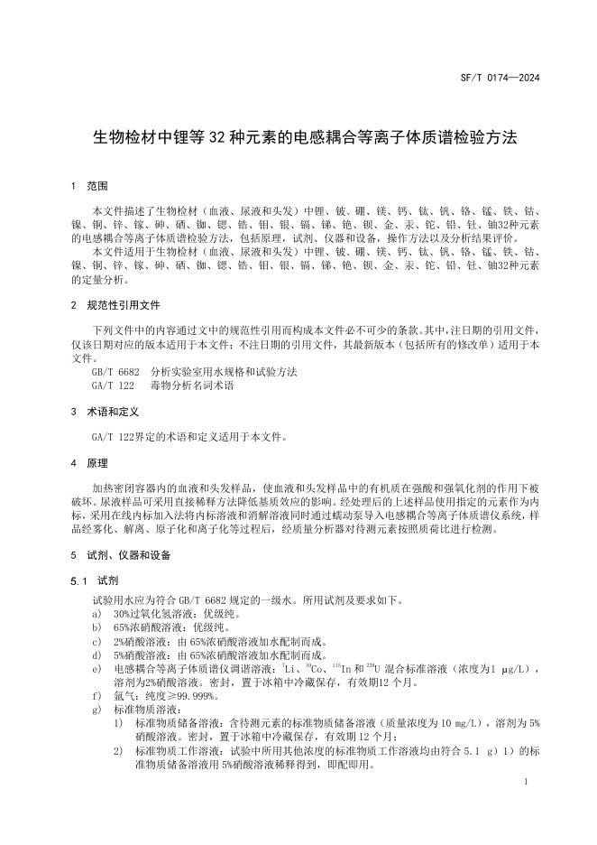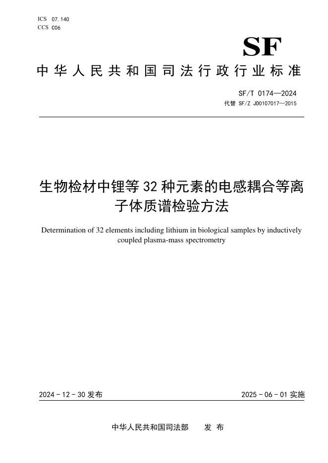 SF/T 0174-2024 生物检材中锂等32种元素的电感耦合等离子体质谱检验方法