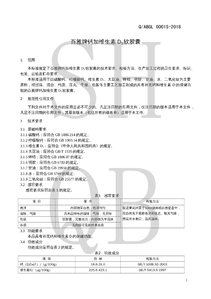 Q/ABGL 0001S-2018 百雅牌钙加维生素D3软胶囊