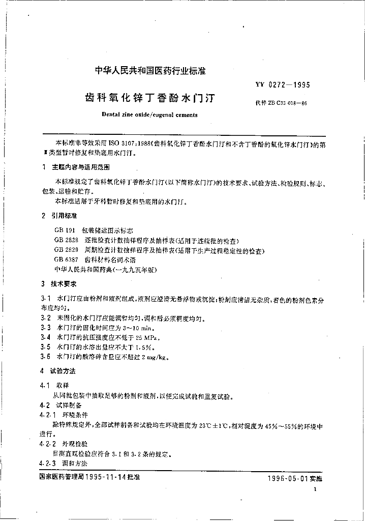 YY 0272-1995 齿科氧化锌丁香酚水门汀