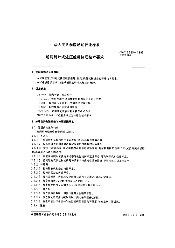CB/T 3680-1995 船用转叶式液压舵机修理技术要求
