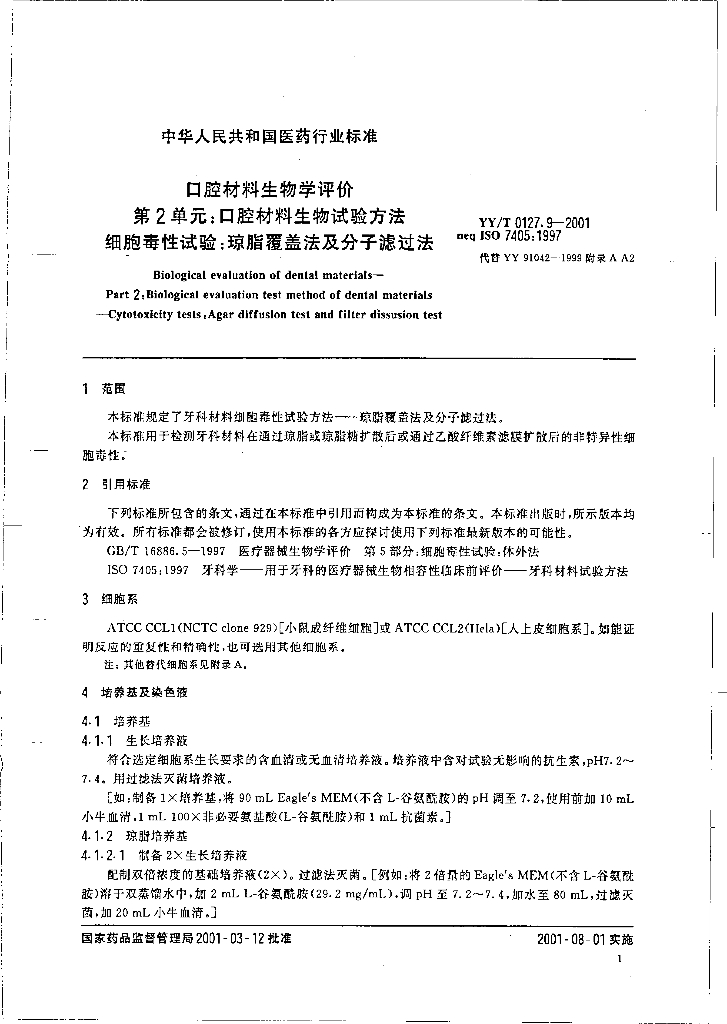 YY/T 0127.9-2001 口腔材料生物学评价 第2单元:口腔材料生物试验方法细胞毒性试验:琼脂覆盖法及分子滤过法