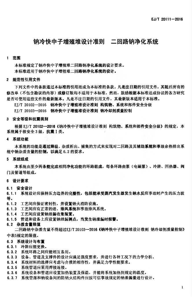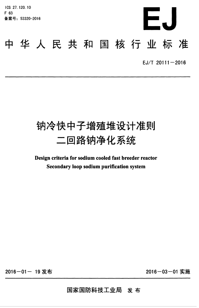 EJ/T 20111-2016 钠冷快中子增殖堆设计准则 二回路钠净化系统
