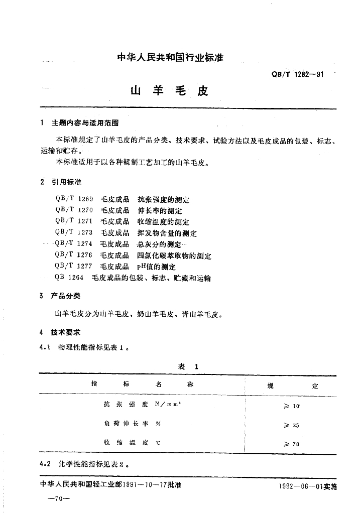 QB/T 1282-1991 山羊毛皮