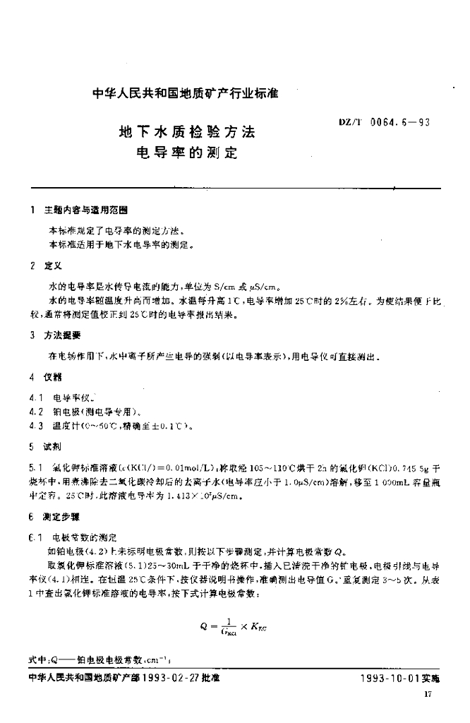 DZ/T 0064.6-1993 地下水质检验方法电导率的测定