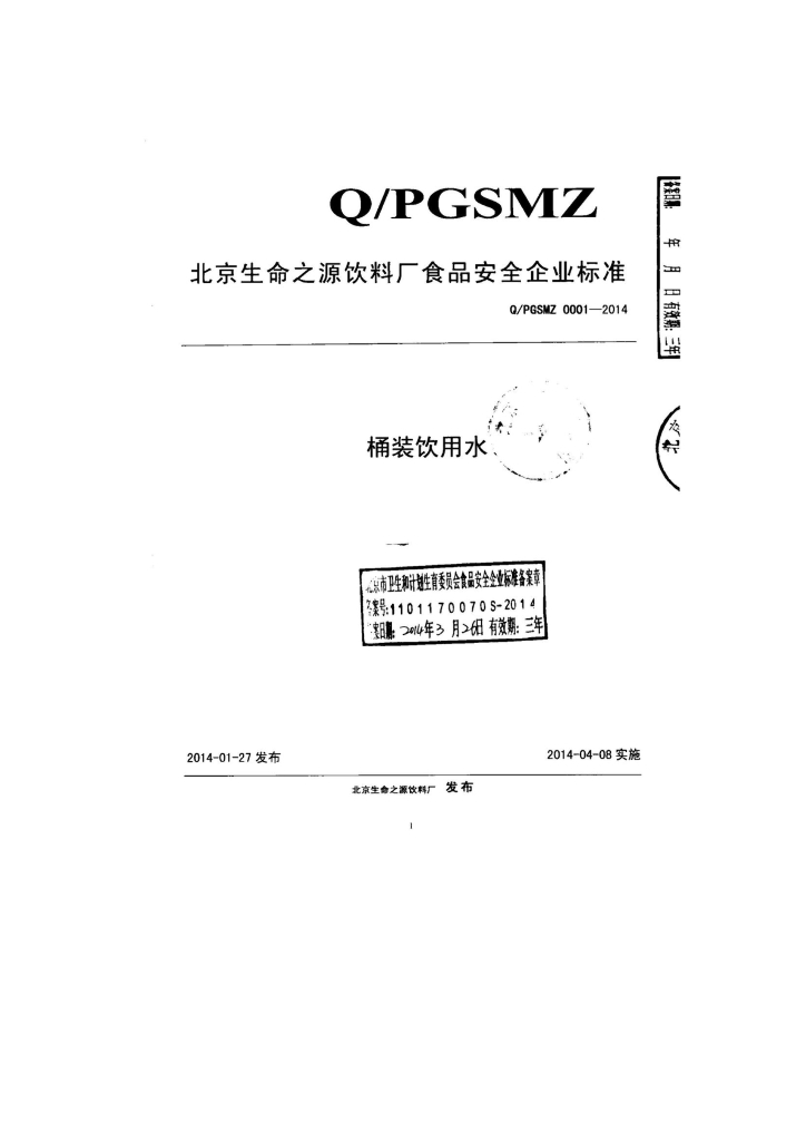 Q/PGSMZ 0001-2014 北京生命之源饮料厂 桶装饮用水