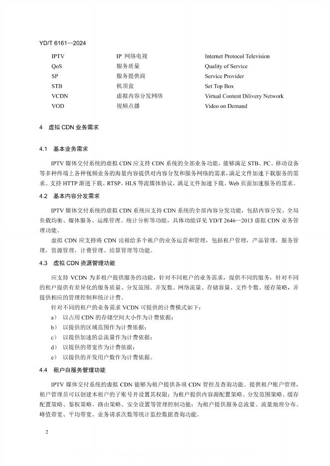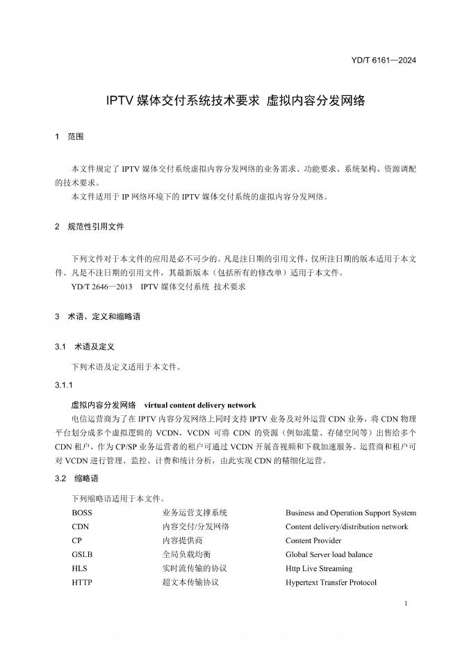 YD/T 6161-2024 IPTV媒体交付系统技术要求 虚拟内容分发网络