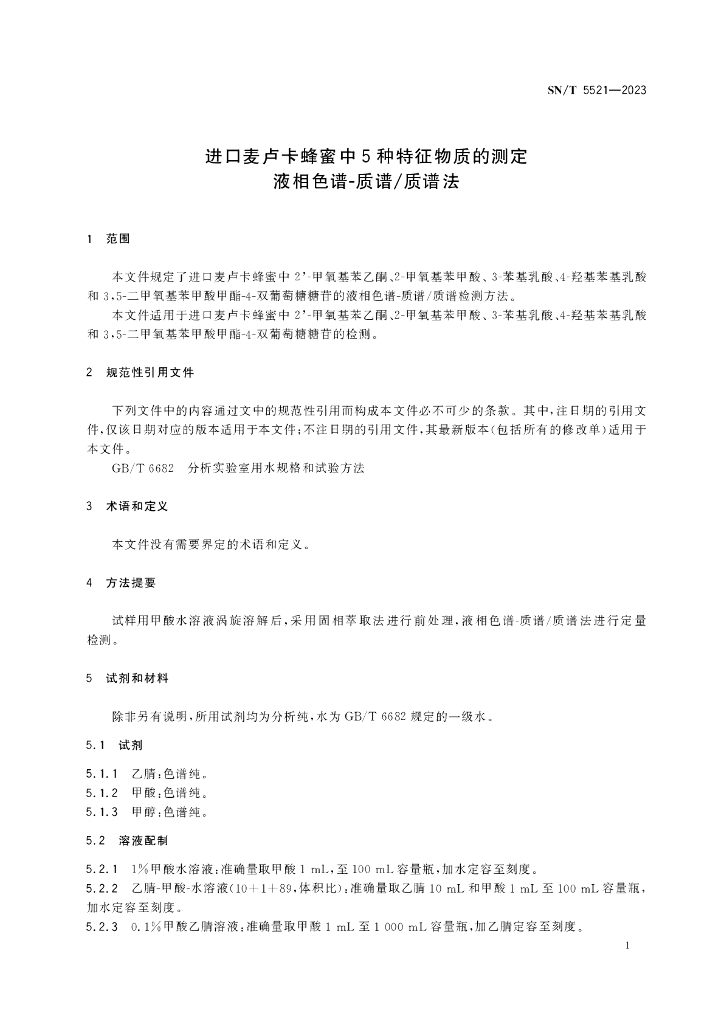 SN/T 5521-2023 进口麦卢卡蜂蜜中5种特征物质的测定 液相色谱-质谱/质谱法