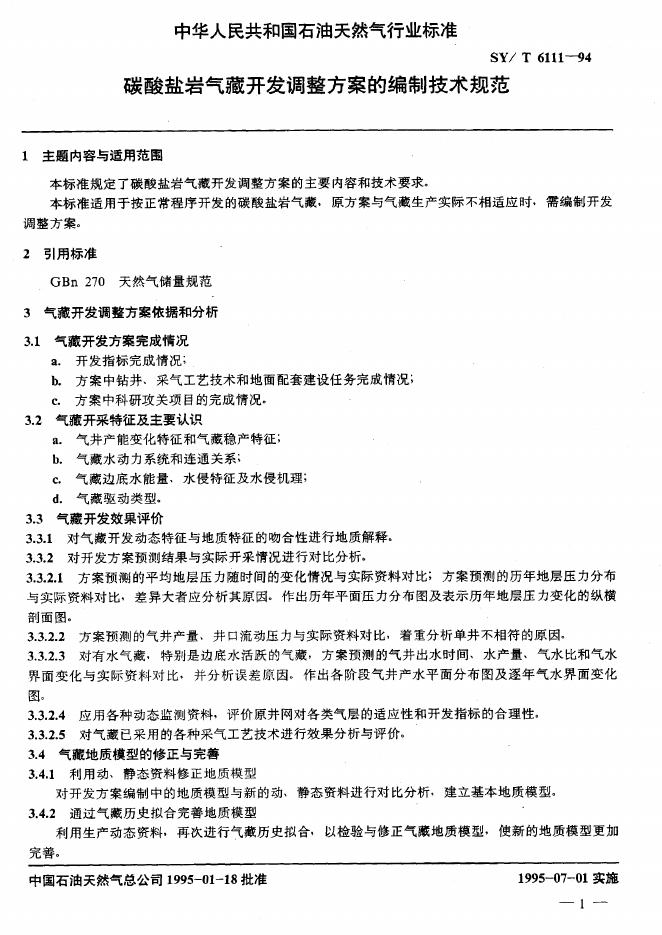 SY/T 6111-1994 碳酸盐岩气藏开发调整方案的编制技术规范