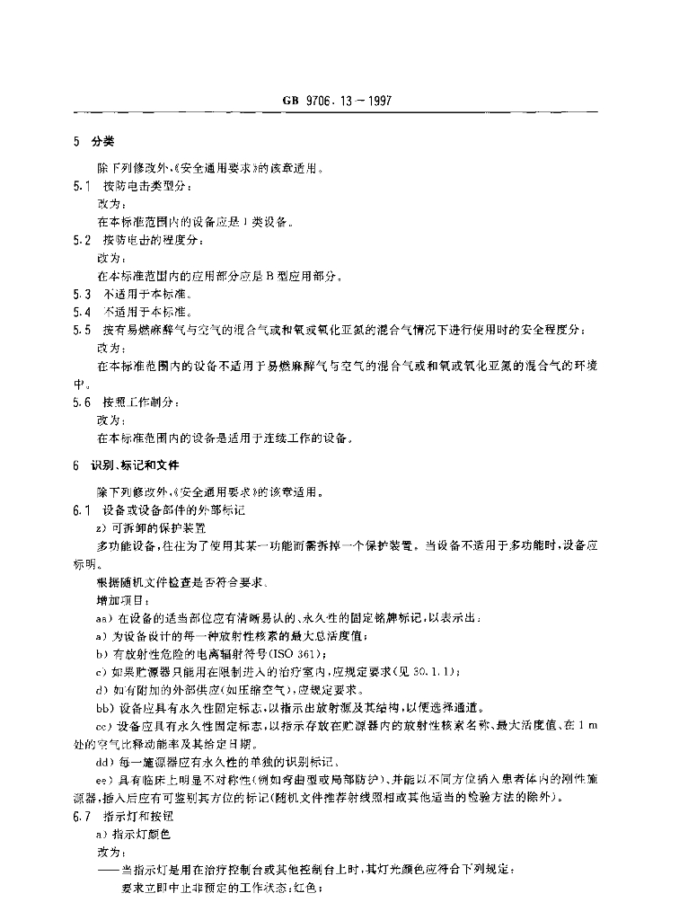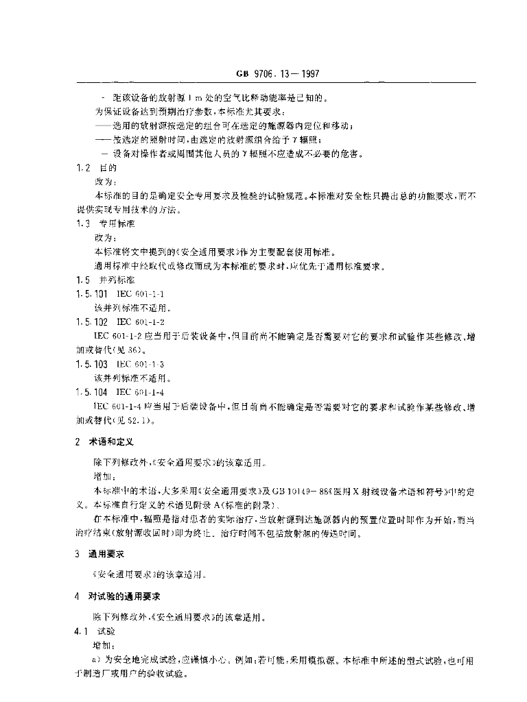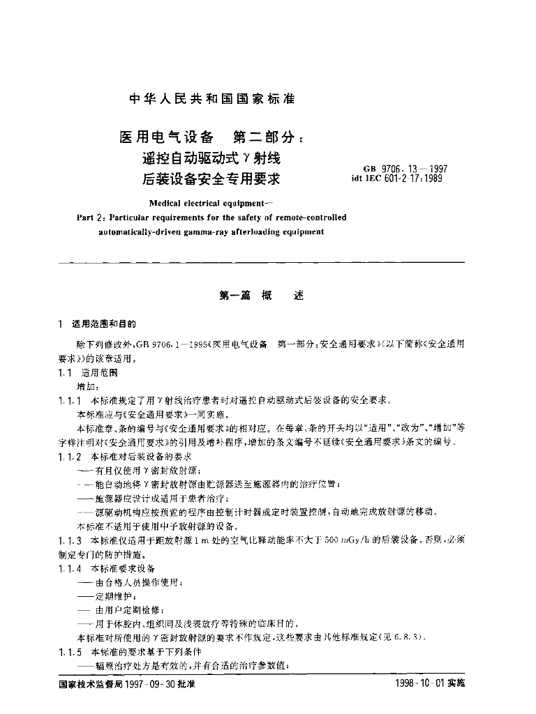 GB 9706.13-1997 医用电气设备 第2部分:遥控自动驱动式7射线后装设备安全专用要求