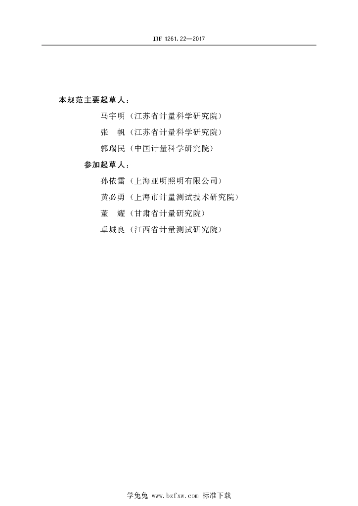 马宇明(江苏省计量科学研究院)、张帆(江苏省计量科学研究院)、郭瑞民(中国计量科学研究院)、孙依雷(上海亚明照明有限公司)、黄必勇(上海市计量测试技术研究院)、董耀(甘肃省计量研究院)、卓城良(江西省计量测试研究院)