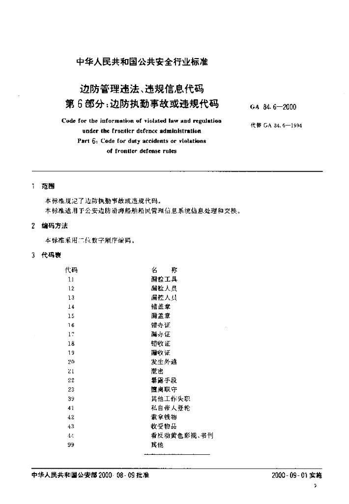 GA 84.6-2000 边防管理违法、违规信息代码 第6部分 边防执勤事故或违规代码