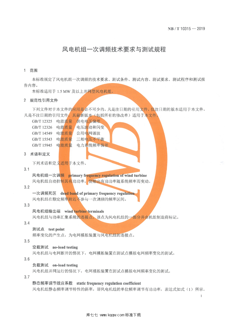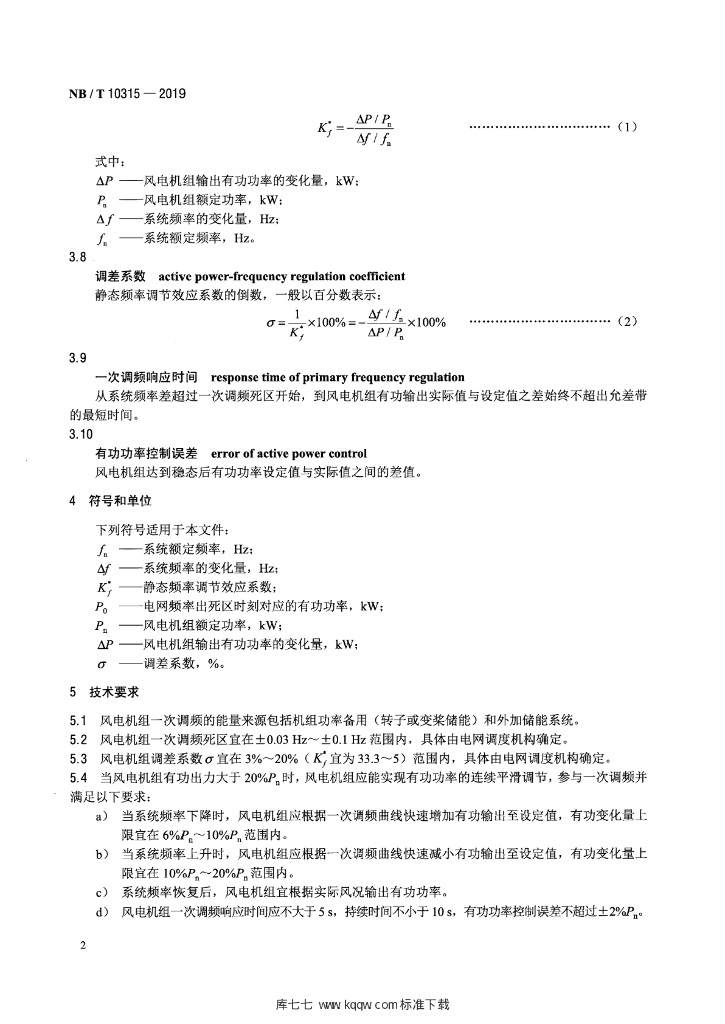 NB/T 10315-2019 风电机组一次调频技术要求与测试规程