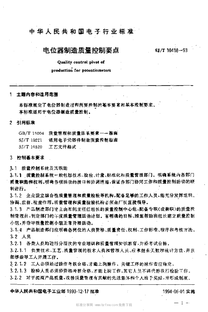 SJ/T 10418-1993 电位器制造质量控制要点