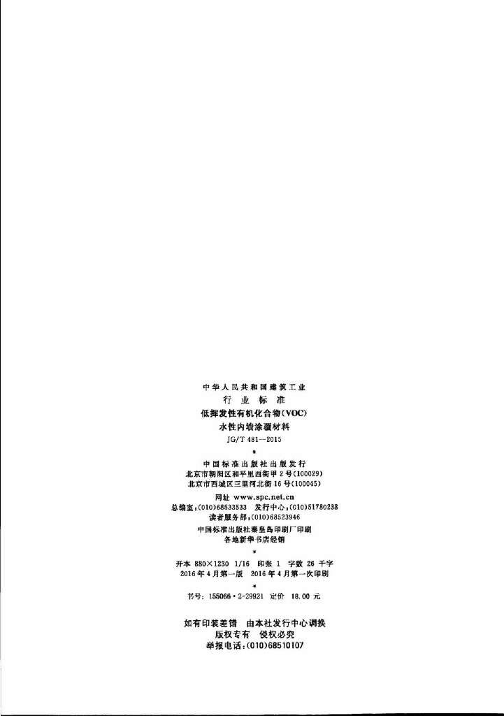 JG/T 481-2015 低挥发性有机化合物(VOC)水性内墙涂覆材料